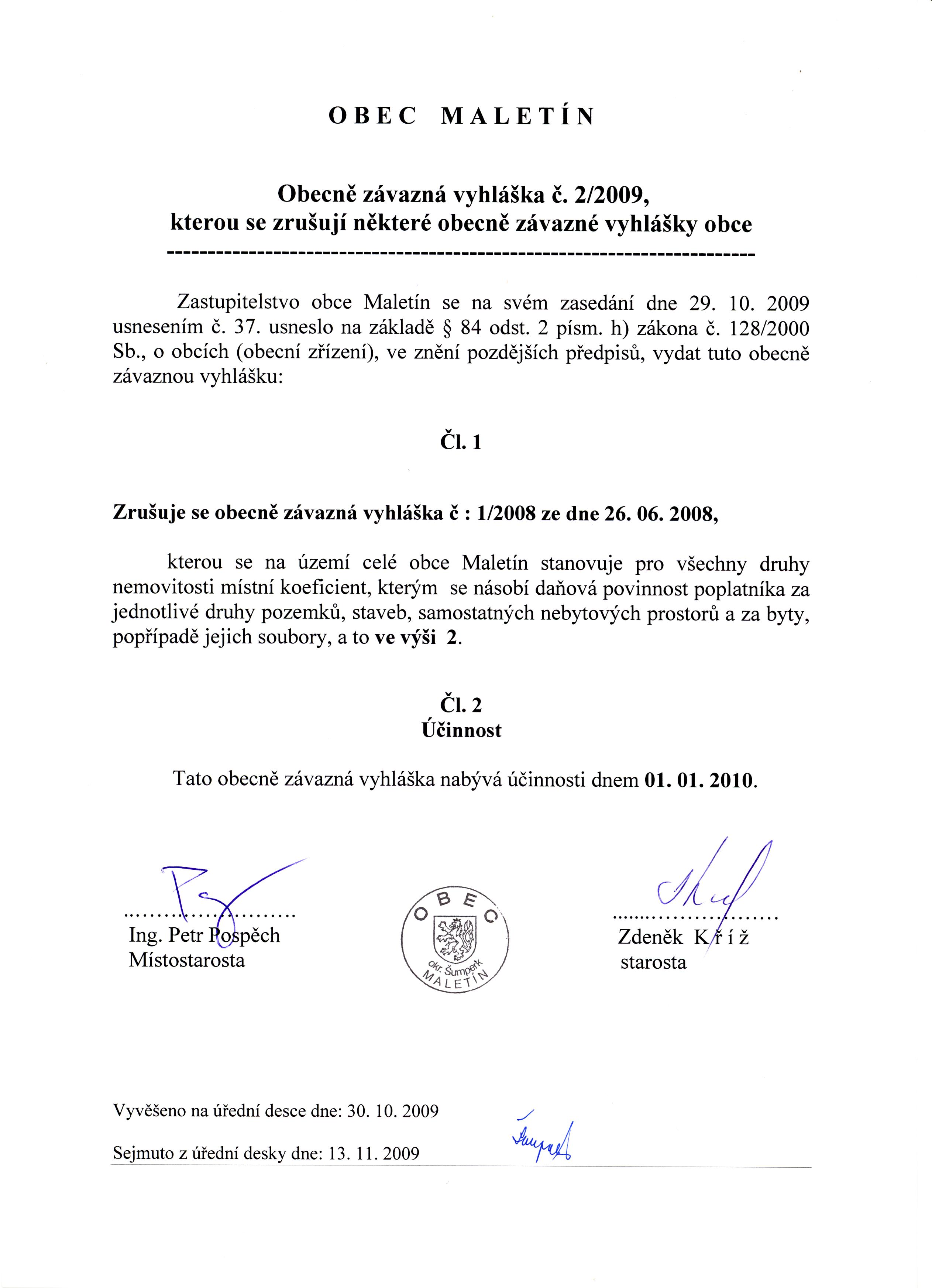 Obecně závazná vyhláška č. 2/2009, kterou se zrušují některé obecně závazné vyhlášky